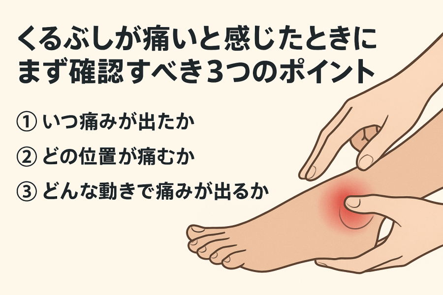 「くるぶし 痛いんだけど、放っておいて大丈夫かな…?」と不安になる方は多いです。そんなときは、まず次の3つをチェックしてみると言われています(https://kabushikigaisya-rigakubody.co.jp/seitai/blog/below-and-inside-the-ankle/)。
