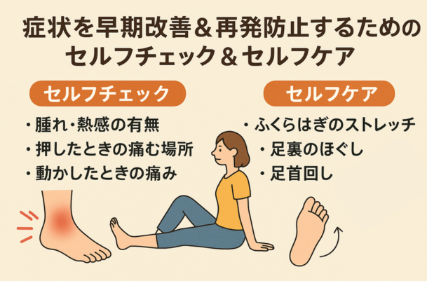 (https://abe-seikei-cli.com/2025/03/17/〜)では、再発予防には**足首の安定性**と**歩き方のクセの改善**が重要とされています。