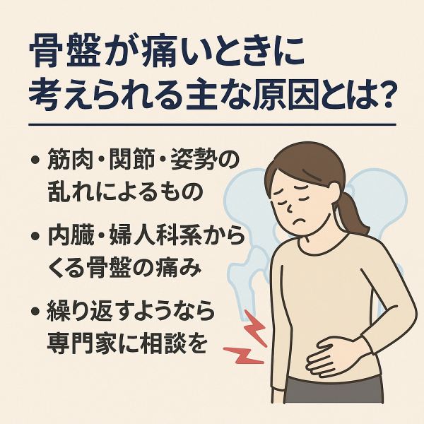 骨盤の痛みは、「筋肉や関節」「姿勢」「内臓の不調」など、複数の要因が関わっていることが多いと言われています。