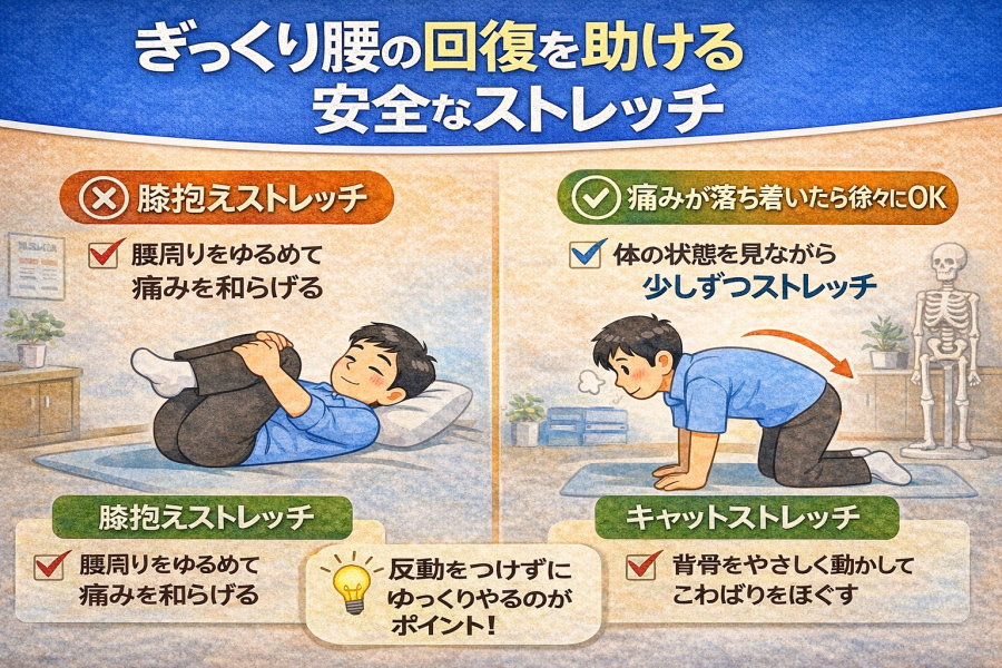 ただし、ストレッチ中に強い痛みが出る場合は無理をしないことが重要とされています。体の状態を確認しながら行うことが、ぎっくり腰の回復を助けるポイントと言われています。