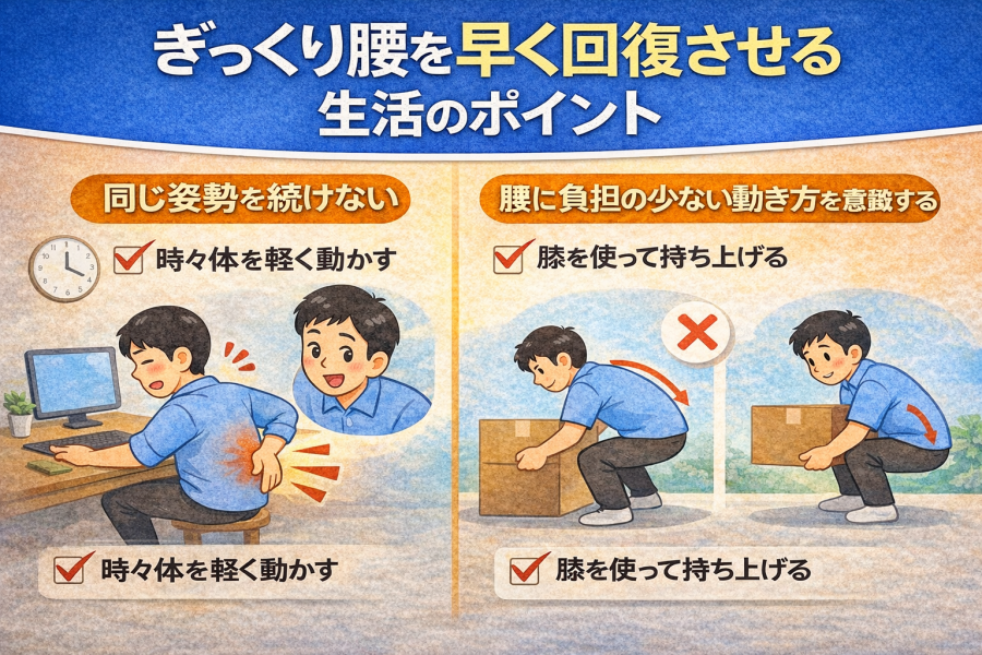 日常生活の動き方も、ぎっくり腰の回復に影響すると言われています。