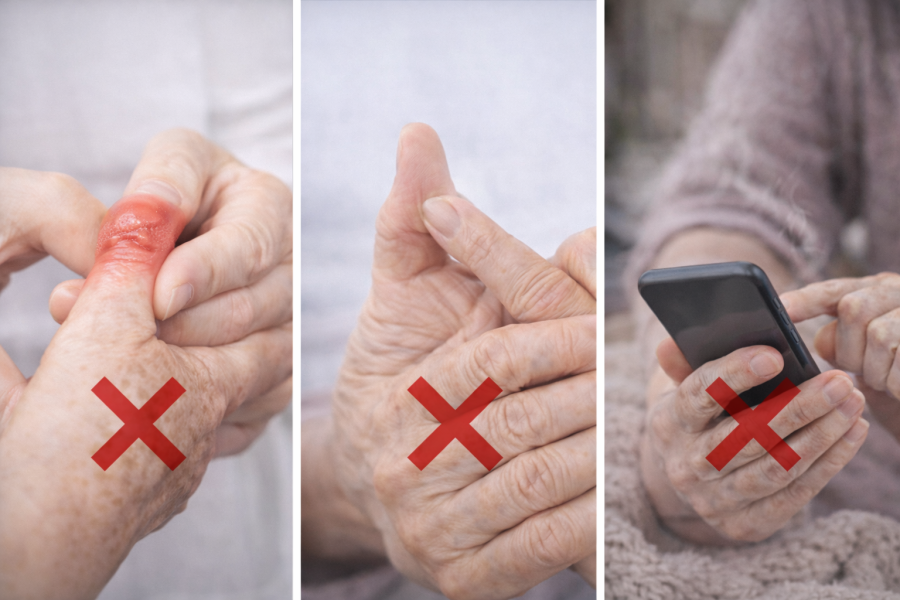 「少しでも楽になれば」と思って、痛む指をぐりぐりもんだり、反らせたりしたくなることがありますよね。ですが、ヘバーデン結節では第一関節に痛みや腫れ、赤みが出ることがあり、こうした時期に強い刺激を入れると関節への負担が増えやすいと言われています。参考記事でも、患部を強くマッサージする行動は避けたい内容として挙げられています。まずは“ほぐす”より“刺激を増やさない”意識のほうが大切だと考えられています。
