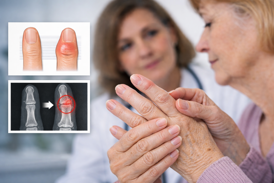 初期は、見た目の変化よりも「なんとなく痛い」「少し熱っぽい」「朝にこわばる感じがある」といった違和感から始まることがあるようです。最初は気のせいかなと思いやすいのですが、使うたびに気になったり、第一関節だけがじんわり痛んだりするなら、無理に使い続けないことが大切だと言われています。進行すると、関節のふくらみがはっきりしてきたり、曲がったまま伸ばしにくくなったりすることもあるそうです。また、第一関節の近くに水ぶくれのようなふくらみが見られる場合もあると言われています。