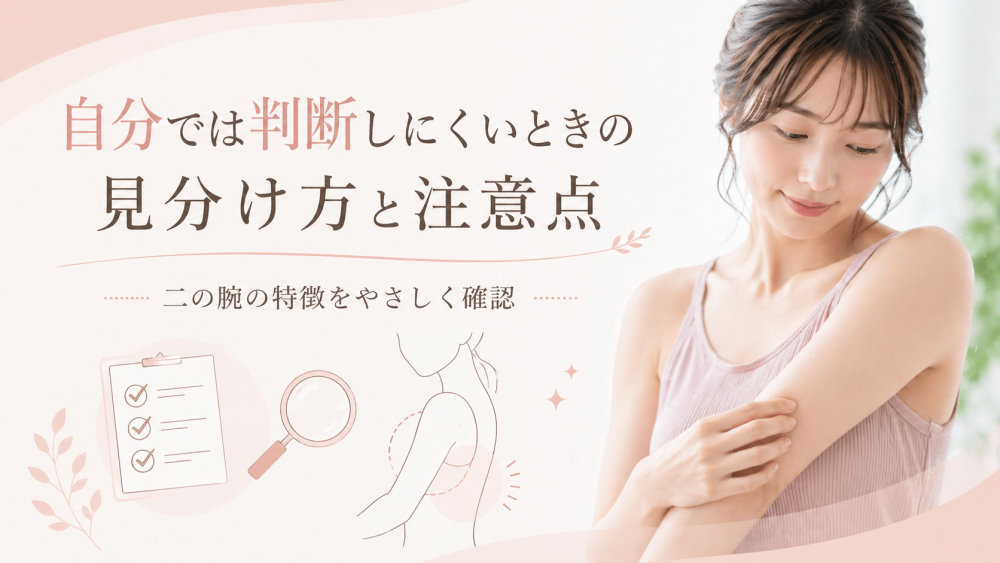 二の腕の太さだけでなく、痛み、しびれ、急な腫れ、左右差が強い場合は、自己判断で強い運動を続けない方が安心です。美容目的のケアとは別に、専門家に体の状態を見てもらうことも選択肢になります。