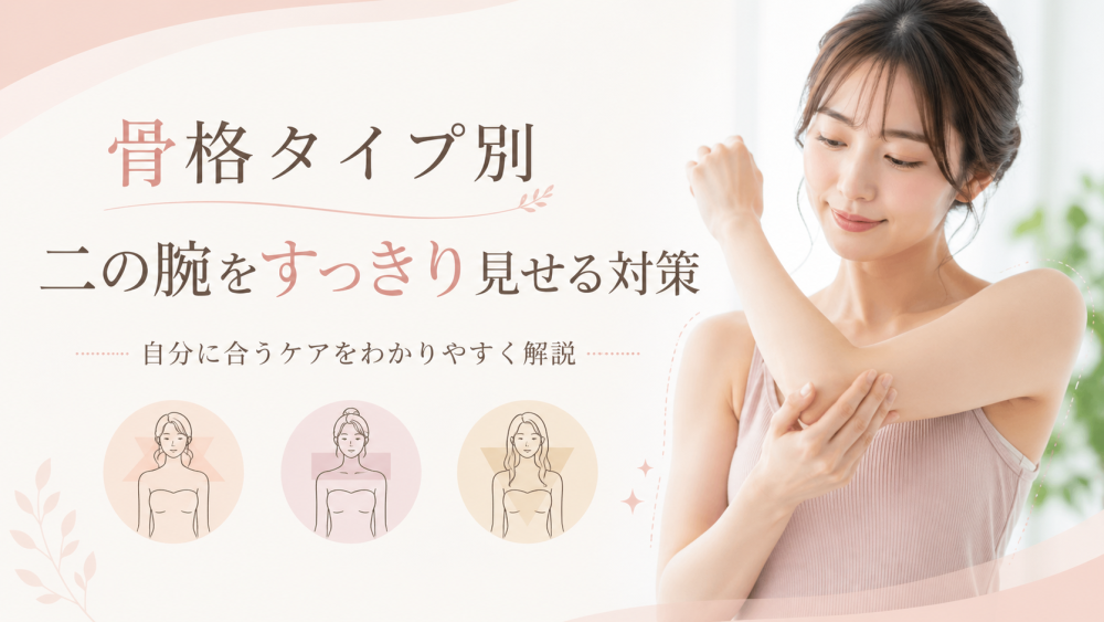 骨格ウェーブは、冷えやむくみが出やすい傾向があると言われています。そのため、二の腕をすっきり見せたい場合は、いきなり強い筋トレをするより、肩甲骨をゆっくり回す、腕の後ろ側を軽く動かす、湯船で体を温めるといったケアから始めるのも一つです。