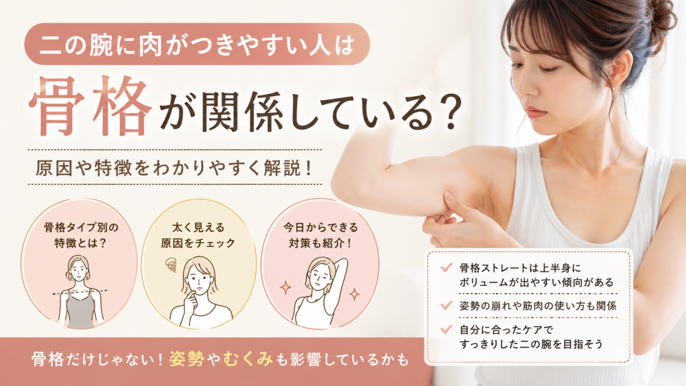 「二の腕に肉がつきやすい人は、骨格が関係しているの?」と気になる方は多いと思います。結論から言うと、骨格は二の腕の見え方に関係すると言われています。ただし、「骨格だけが原因」と決めつけるのは少し早いです。