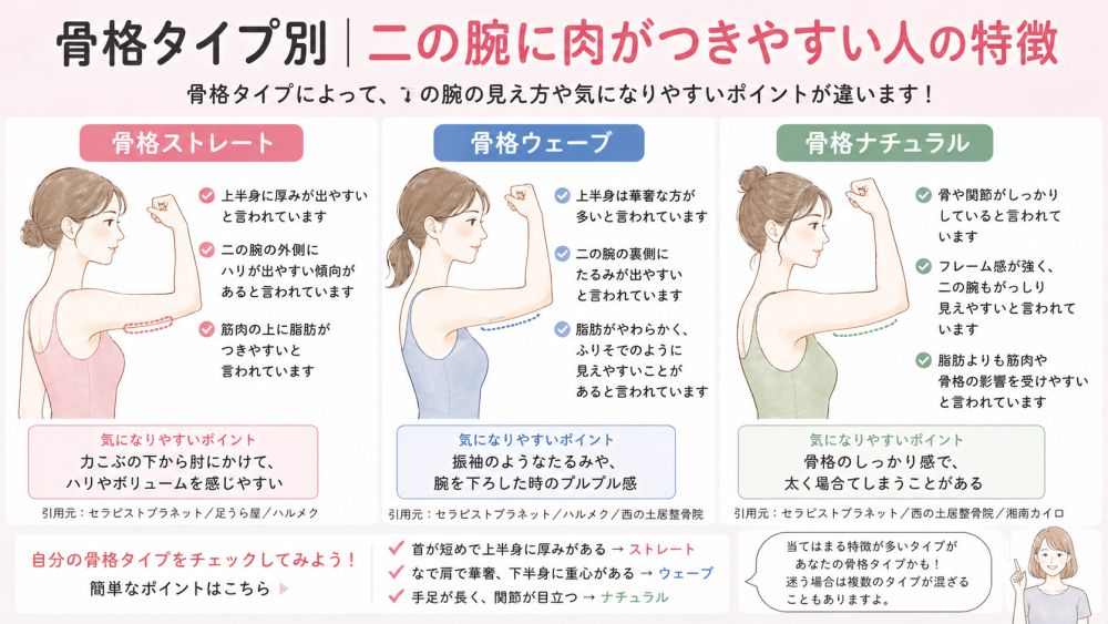 参考記事では、二の腕に肉がつきやすい骨格として「ストレートタイプ」が紹介されています。骨格ストレートは上半身に厚みが出やすく、筋肉の上に脂肪が乗るような形になりやすいため、二の腕の外側が目立ちやすい傾向があると言われています。