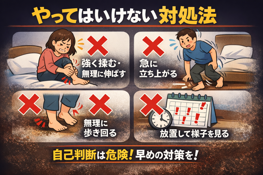 「痛いから、とにかく揉んだほうがいいのでは?」と思いやすいのですが、夜中に足が痛いときは、強く押したり勢いよく伸ばしたりしないほうがよいと言われています。特に、こむら返りのように筋肉が急に縮んでいる場面では、刺激を強くしすぎると、かえってつらさが長引くこともあるようです。まずは呼吸を整えて、ゆっくり動かすくらいが無難とされています。
