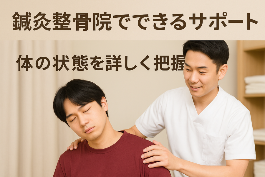鍼灸整骨院では、触診を通じて筋肉の緊張や姿勢の乱れを確認し、自律神経や血流のバランスをサポートする施術が行われることがあります。セルフケアだけでは変化を感じにくい方も、専門家の視点を取り入れることで、自分に合った対策が見つかりやすくなると言われています(全日本鍼灸学会)。