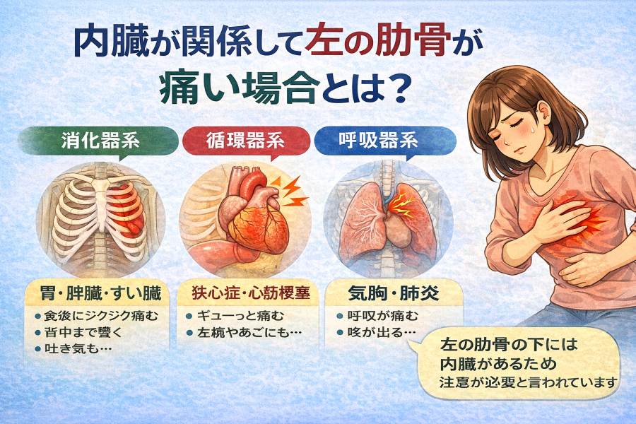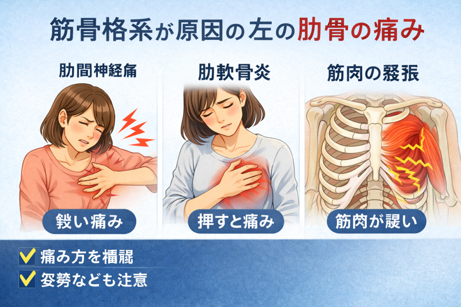 たとえば、左の肋骨を軽く押した時に痛みが強くなる場合、参考ページでも肋軟骨部分の負担や筋肉の緊張が関係すると考えられていると説明されています。