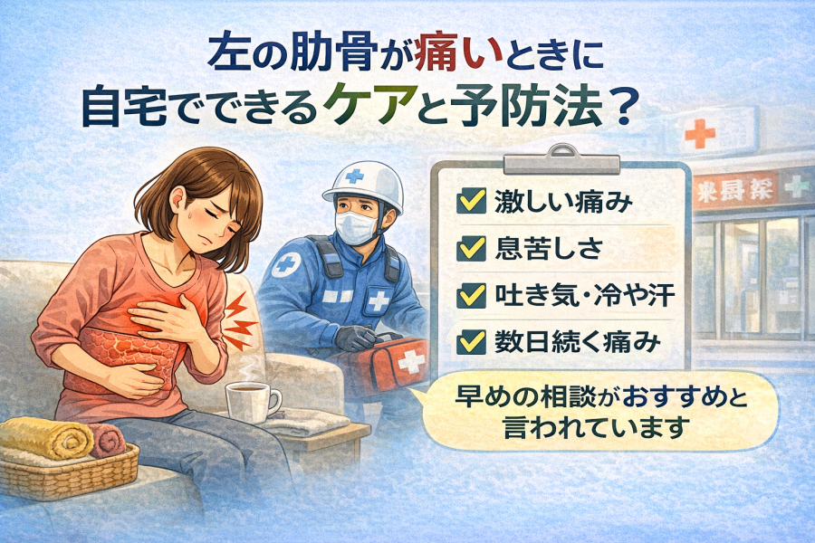 左の肋骨が痛いと感じた時、「病院へ行くほどではないけれど、少し気になる…」という声をよく聞きます。参考記事でも、筋肉や姿勢の影響による痛みは日常の工夫でラクになる場合があると言われており、まずは自分でできる範囲から整えてみる方法が紹介されています(https://awata-ojikouen.com/symptom/rokkan/)。