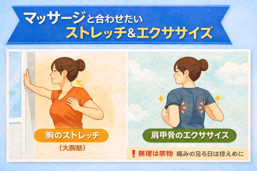 マッサージでゆるめた体を、そのままにせず、ストレッチや軽いエクササイズで動かしてあげることが、姿勢を意識しやすくする一歩になると考えられています。