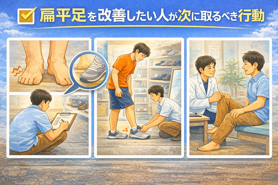 扁平足で悩んでいる方の多くが、ここで立ち止まります。参考記事でも、**最初に大切なのは“今の足の状態を知ること”**だと言われています。