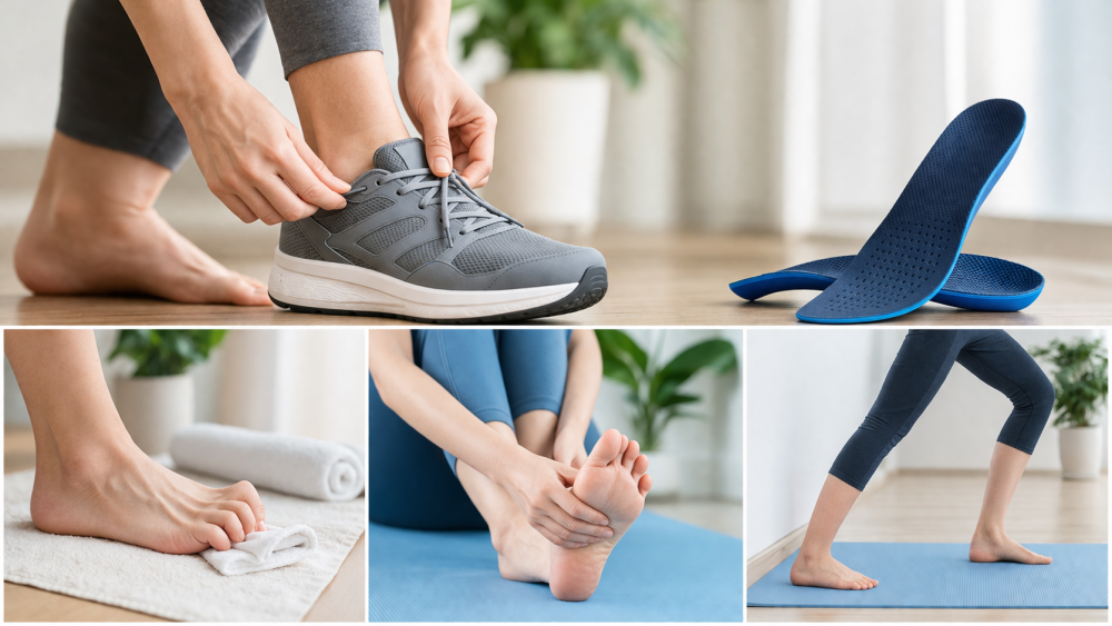 もうひとつは、足そのものを使いやすくしていくことです。日本整形外科学会では、足指の筋肉はアーチを支えるうえで重要で、アキレス腱のストレッチも予防に役立つとされています。参考記事でも、足指じゃんけんやタオルギャザーのような運動が紹介されています。すぐ大きく変わるというより、少しずつ負担を減らす方向で続けるイメージのほうが自然です。痛みが強い日は、頑張りすぎないことも大事だと言われています。