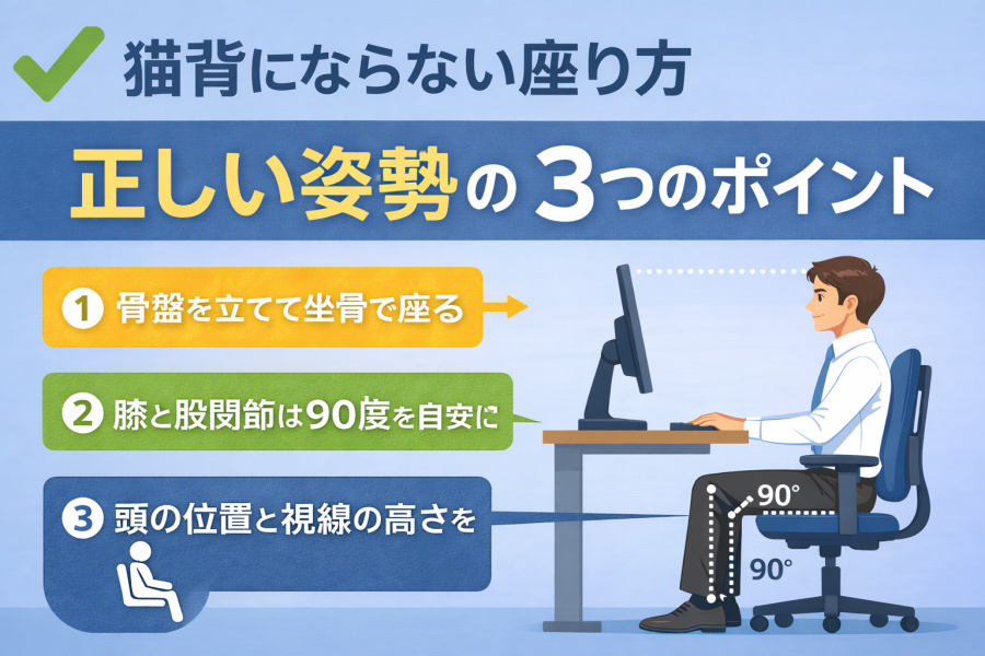 具体的には、お尻の下にある「坐骨」という骨で体を支えるイメージで座る方法がよいとされています。背中を無理に反らすのではなく、骨盤の位置を整えることで自然と背筋が伸びた姿勢になりやすいと言われています。