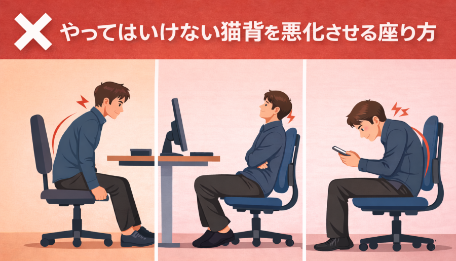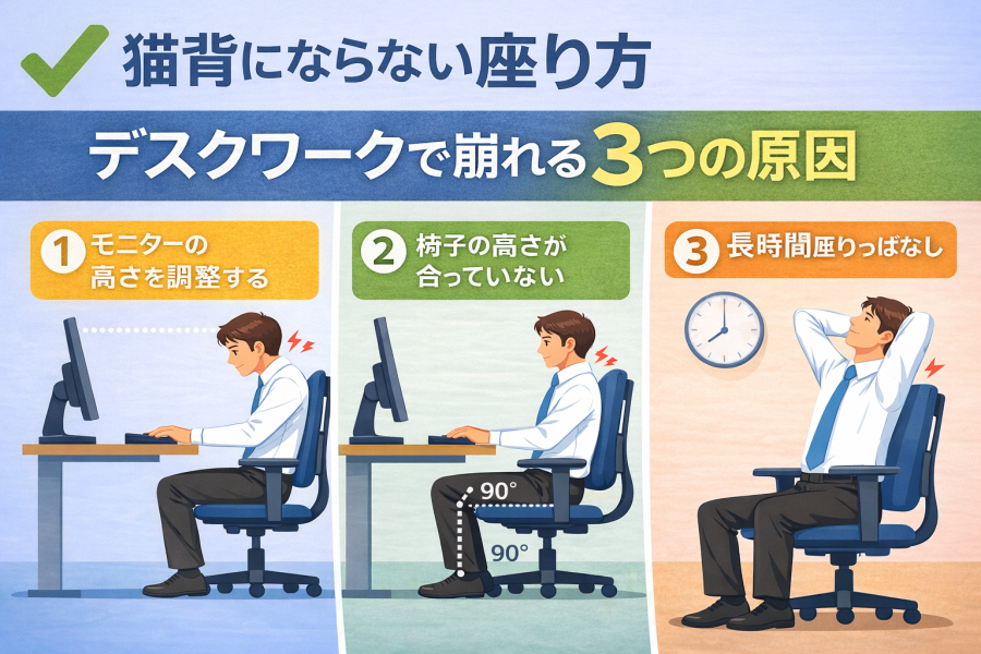 「長時間座っていると、気づいたら背中が丸くなっている…」そんな経験はありませんか。実は猫背は、特別なことが原因というよりも、日常の何気ない座り方のクセから起こることが多いと言われています。とくにデスクワークやスマートフォンの使用時間が長い方は、知らないうちに姿勢が崩れてしまうケースが少なくありません。ここでは、猫背になりやすい座り方の代表的な原因を見ていきましょう。