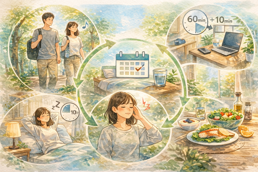 「忙しい時期ほど調子が悪い」と感じるなら、生活リズムも無視しづらいです。緊張型頭痛は、ストレス、睡眠障害、首の痛み、眼精疲労などが引き金になることがあると言われています。つまり、耳鳴り・頭痛・肩こりを繰り返さないためには、首肩だけでなく、休み方まで整えることが大事になってきます。寝る直前までスマホを見続けない、ぬるめのお風呂で力を抜く、休日に少し外を歩く。そんな地味な習慣の積み重ねが、結果的に不調の予防につながると言われています。