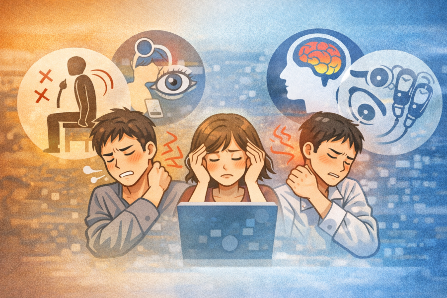 「耳鳴りもあるし、頭も重い。しかも肩までつらい…」となると、別々の症状に見えて不安になりますよね。ですが、耳鳴り・頭痛・肩こりは、首や肩まわりの筋肉の緊張、姿勢の崩れ、ストレス、自律神経の乱れなどが重なって、同時に出ることがあると言われています。特に、長時間のスマホやパソコン作業が続くと、首が前に出やすくなり、肩まわりの負担が増えやすいようです。その結果、肩こりだけでなく、頭の重さや耳の違和感につながる場合もあると考えられています。
