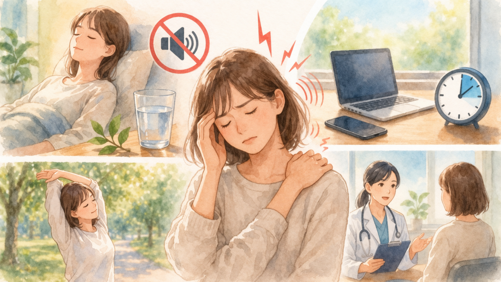 「何をしたらいいの?」と迷ったら、最初は頑張りすぎないことが大切です。耳鳴り・頭痛・肩こりが重なるときは、疲労や緊張が強まっている場合があると言われています。そんなときは、静かな場所で少し休む、スマホやパソコンを見る時間をいったん減らす、強い音を避ける、といった対応から始めやすいでしょう。頭痛はストレスや睡眠不足、眼精疲労、首の痛みなどが引き金になることもあるようです。