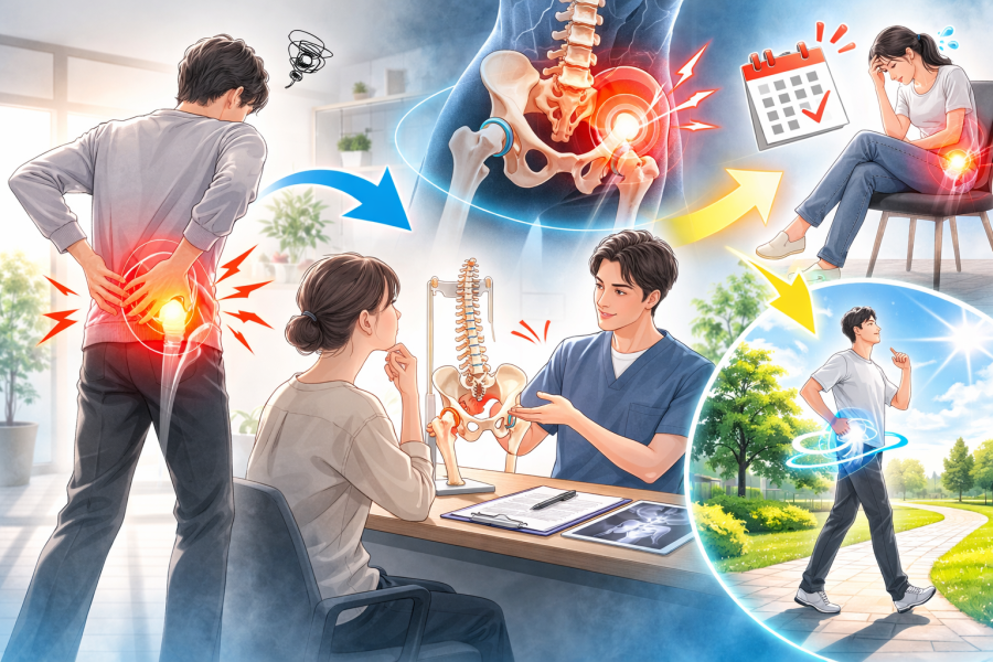 特に、足を組むクセがあったり、片側に体重をかけて立つことが多い方は、このような状態になりやすい傾向があるとも言われています。「なんとなくいつも同じ側が痛い」という場合は、股関節の影響も疑われるポイントになります。