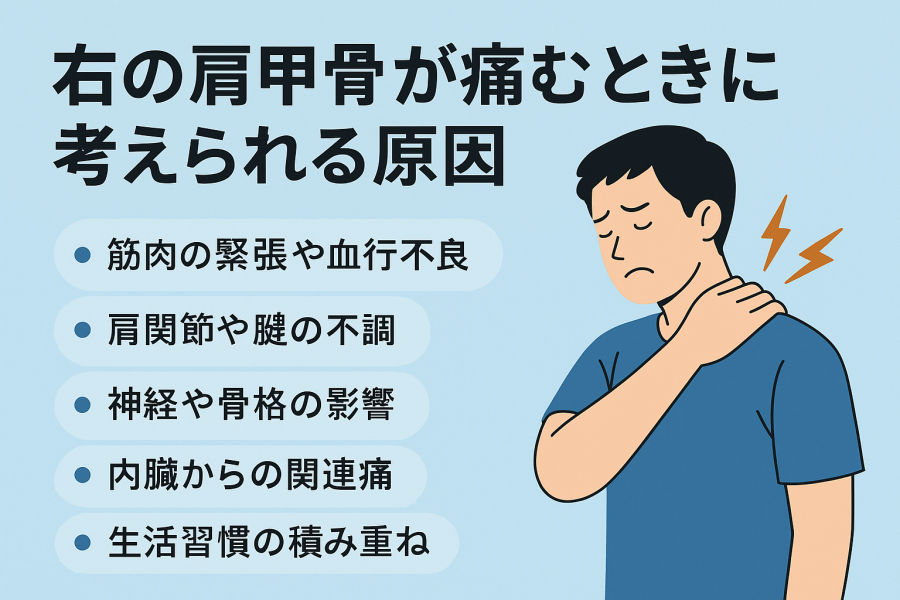 右側の肩甲骨が痛むとき、その背景にはいくつかの要因があると言われています。一般的には筋肉のこりや姿勢の乱れが関係することが多いですが、神経や内臓の影響が隠れているケースもあります。ここでは代表的な原因を整理してみましょう。(くまのみ整骨院ブログ)