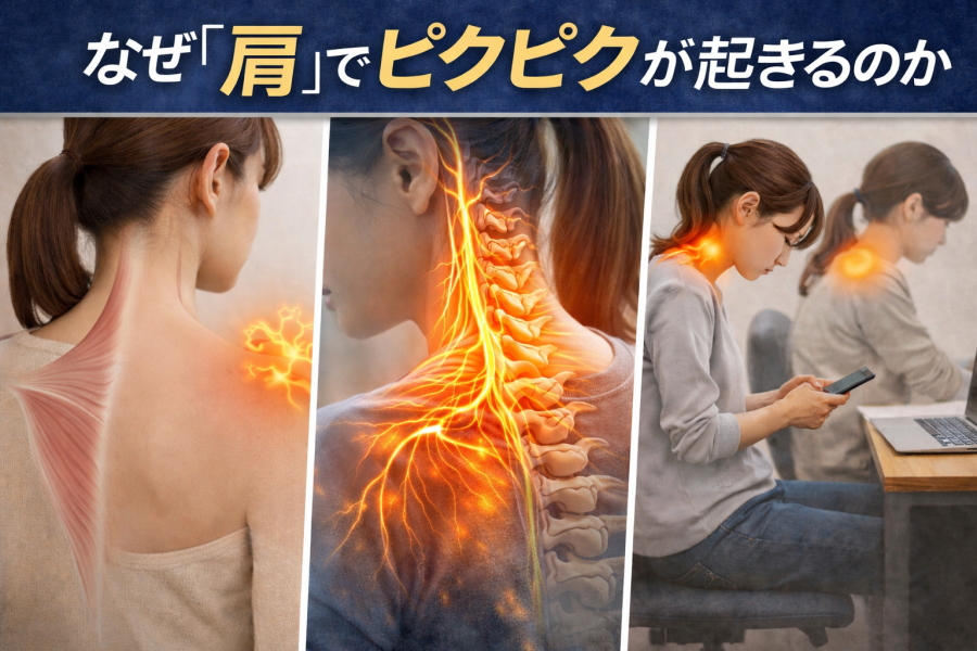 こう疑問に感じる方は多いです。実は、肩は体の中でも特に負担がかかりやすく、神経の影響も受けやすい場所だと言われています。筋肉と神経、この2つの特徴が重なることで、ピクピクとした動きが起こりやすくなると考えられています。