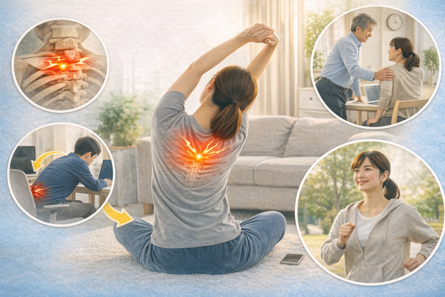 再発予防で大事なのは、背中まわりに同じ負担をかけ続けないことです。Mayo Clinicでは、椎間関節の不調に関わる要因として年齢、外傷歴、姿勢の乱れなどを挙げており、痛みは一定時間動かないあとや睡眠後に強まりやすいと説明しています。参考記事でも運動不足が原因のひとつとして挙げられているため、長時間同じ姿勢を続けないこと、胸椎まわりをやさしく動かす習慣を持つこと、猫背気味の姿勢をそのままにしないことが、再発予防につながると言われています。