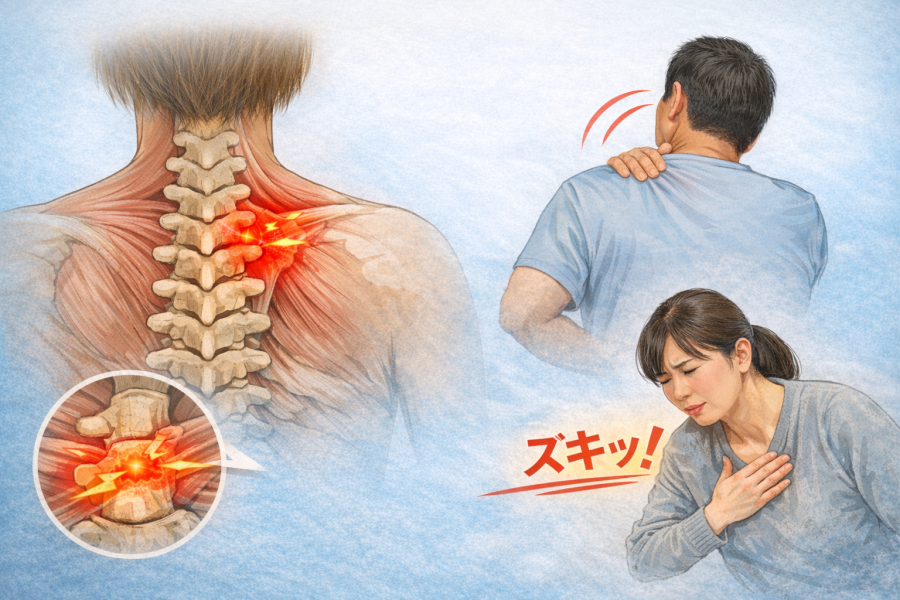 「ただの背中のこりかな?」と思っていても、実は胸椎椎間関節症のような状態が関わっていることがあると言われています。参考記事では、胸椎椎間関節症の主な症状として、胸や背中の痛みが出やすいと紹介されています。痛み方もひとつではなく、ズキッとするような鋭い痛みを感じることもあれば、重だるい違和感が続く場合もあるようです。さらに、痛む場所が背中の真ん中だけとは限らず、肋骨まわりに広がるように感じるケースもあると言われています。