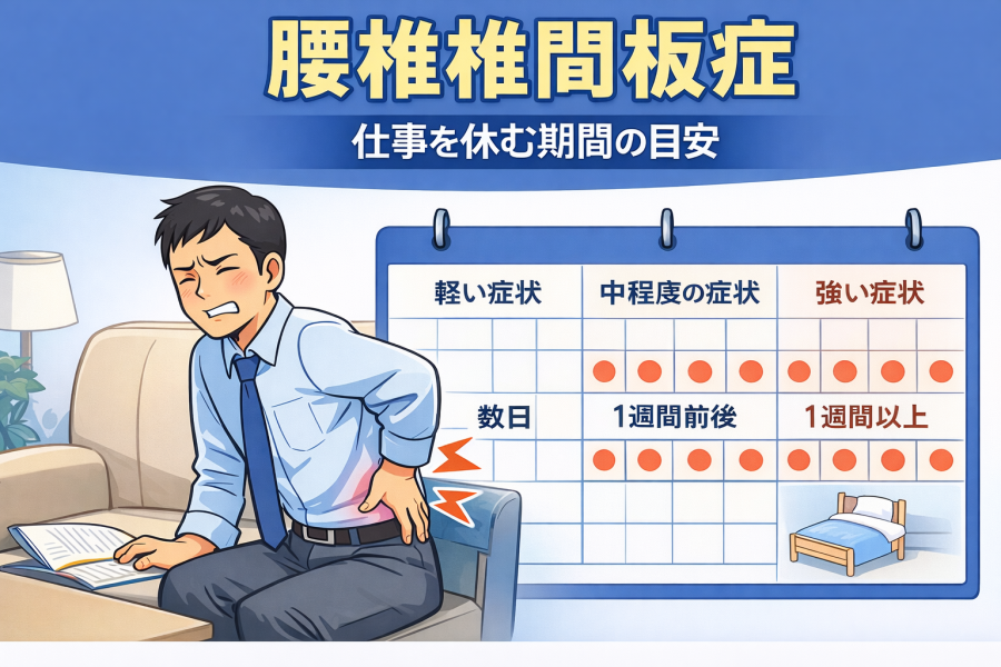 腰椎椎間板症の場合、仕事を休む期間は症状の程度や仕事内容によって変わると言われています。たとえば軽い違和感程度で動くことができる場合は、姿勢に気をつけながら仕事を続けられるケースもあると紹介されています。一方で、痛みが強く動作がつらい場合には、体を休める時間を作ることが大切だと言われています。
