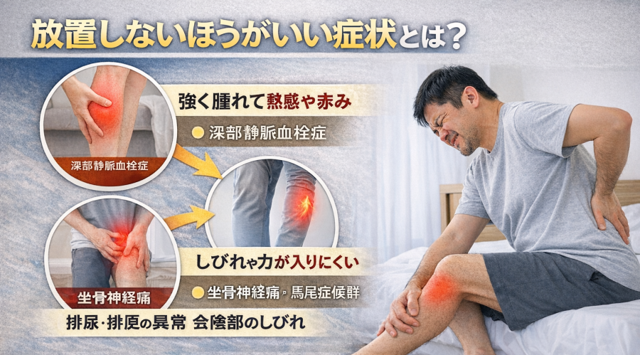 腰痛とふくらはぎのだるさがあると、「少し様子を見ようかな」と思うことはありますよね。ですが、両脚のしびれが強い、足に力が入りにくい、排尿しづらい、便の感覚がおかしい、陰部まわりがしびれる、といった症状がある場合は、早めに病院へ相談したほうがよいと言われています。参考記事でも、腰から脚にかけての症状は神経の影響が関わることがあると紹介されています。公的な医療情報でも、こうした変化は急いで確認したいサインとして案内されています。