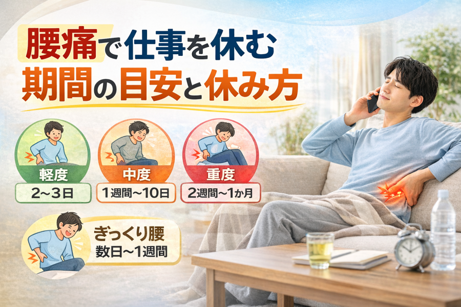 「腰痛で仕事を休むとして、何日くらい休めばいいの?」と気になる方は多いと言われています。実際のところ、休む期間はみんな同じではなく、痛みの強さや仕事内容によって変わることがあるようです。たとえば、軽い違和感であれば数日で様子を見る場合もある一方で、立ち上がりや歩行がかなりしづらいときは、もう少し休養が必要になるとも言われています。デスクワークなのか、荷物を持つ仕事なのかでも負担のかかり方は違うため、「何日」と決めつけず、今の体の状態に合わせて考えることが大切とされています。