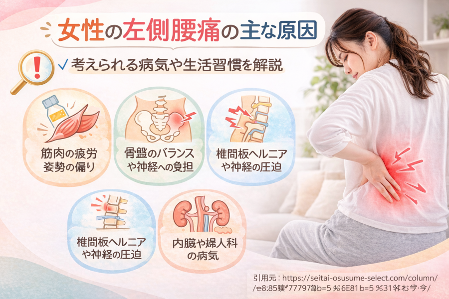 実際には、女性の左側腰痛は日常生活の姿勢や体の使い方が関係するケースが多いと言われています。