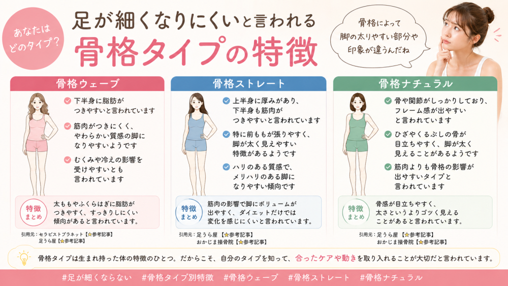 ただし、どの骨格タイプでも「このタイプだから足が細くならない」と決めつけるのは注意が必要です。むくみ、歩き方、靴の選び方、足裏の使い方なども関係すると言われています。まずは骨格を知りつつ、今の生活のクセまで見直していくことが大切です。