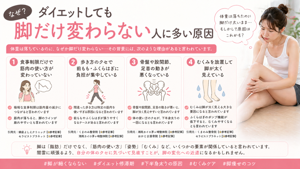 ダイエットしても脚だけ変わらないときは、体重だけを見るより、むくみ、冷え、歩き方、筋肉の使い方を一緒に確認することが大切です。「骨格だから無理」と決める前に、日常のクセを見直してみましょう。