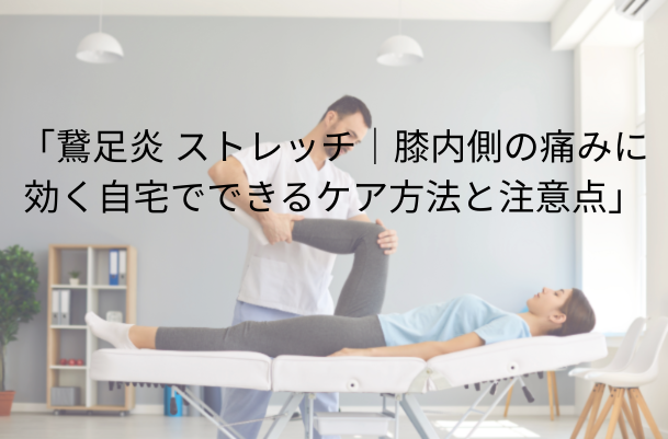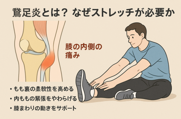 よくいただく質問の一つです。鵞足炎は、太ももの裏や内側の筋肉が硬くなることで膝の内側に負担が偏りやすいと言われており、ストレッチが役立つケースもあるとされています(https://naorusalon.com/column/gasokuen-sutoretti/)。
