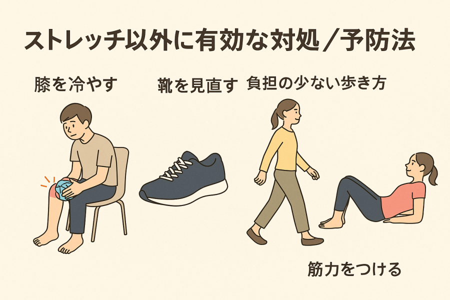 太もも前側ばかり強く、内ももやお尻の筋肉が弱いと、膝の内側に負担が寄りやすいと言われています。そのため、軽い筋トレ(内転筋・お尻のトレーニング)を併用すると予防の一助になるとされています。